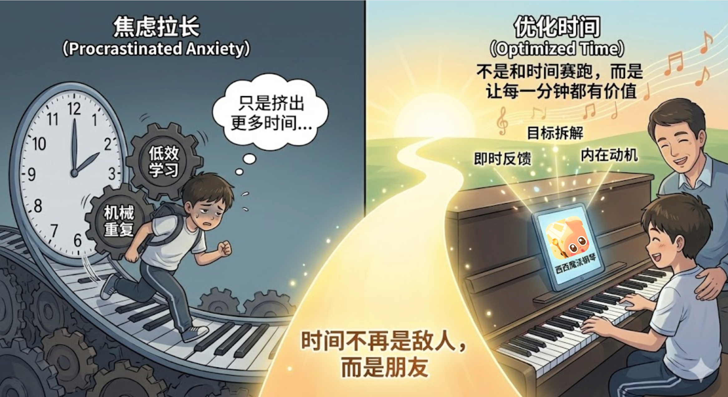 琴童家庭面临的困境更复杂:上学、作业、练琴、兴趣班...每项都不能少,每项都要时间。家长的焦虑不是来自时间不够,而是来自"不知道时间花在哪里才最值得"。