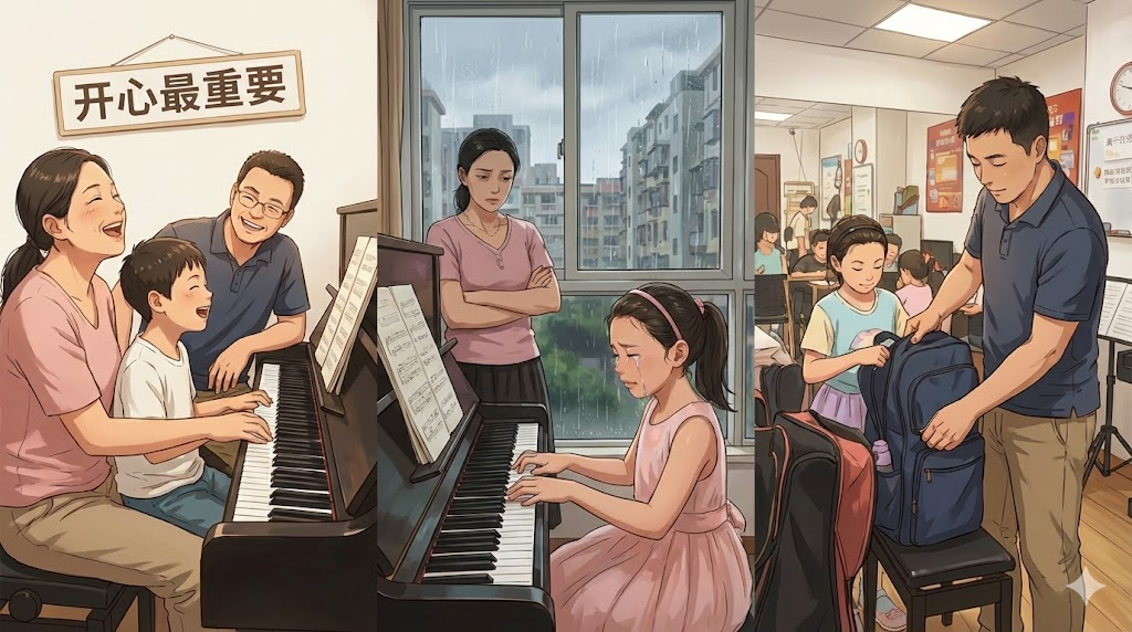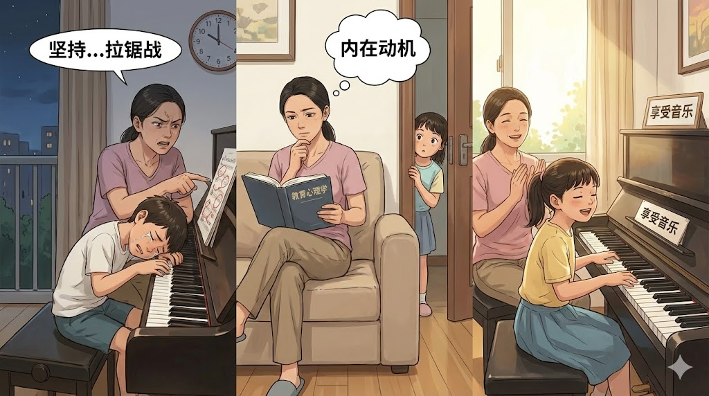 教育心理学里有个概念叫"内在动机"。外在压力(考级、比赛、家长期望)能推着孩子走一段,但走不远。只有当孩子觉得"我想弹"而不是"我得弹",坚持才不会那么痛苦。