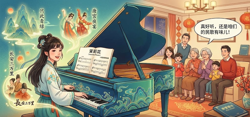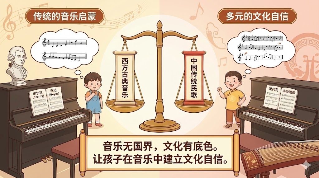 车尔尼依然要练,莫扎特依然要学,但《茉莉花》《丰收渔歌》同样值得学。让孩子在音乐启蒙阶段就接触中国旋律、了解民歌背后的文化故事,这是审美多元化,也是文化自信的建立。