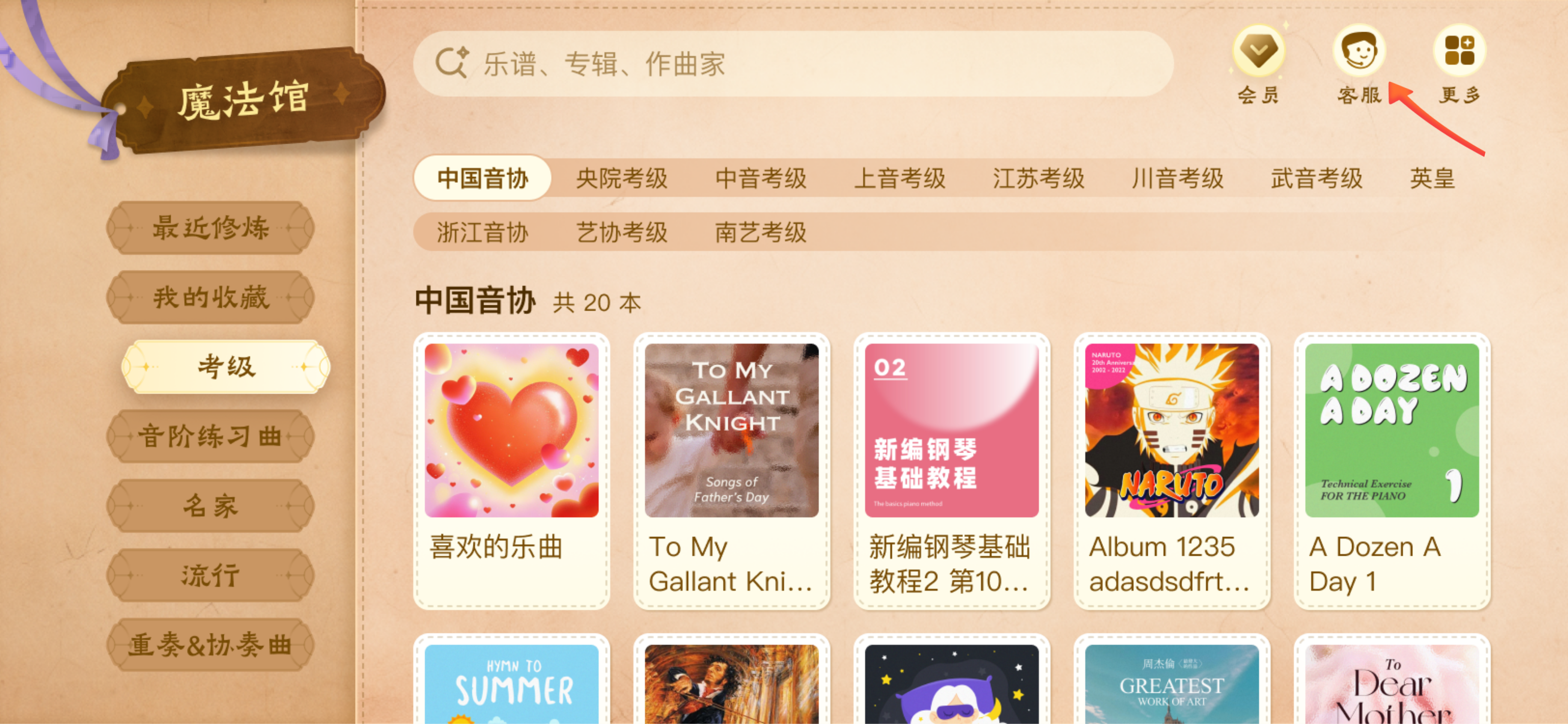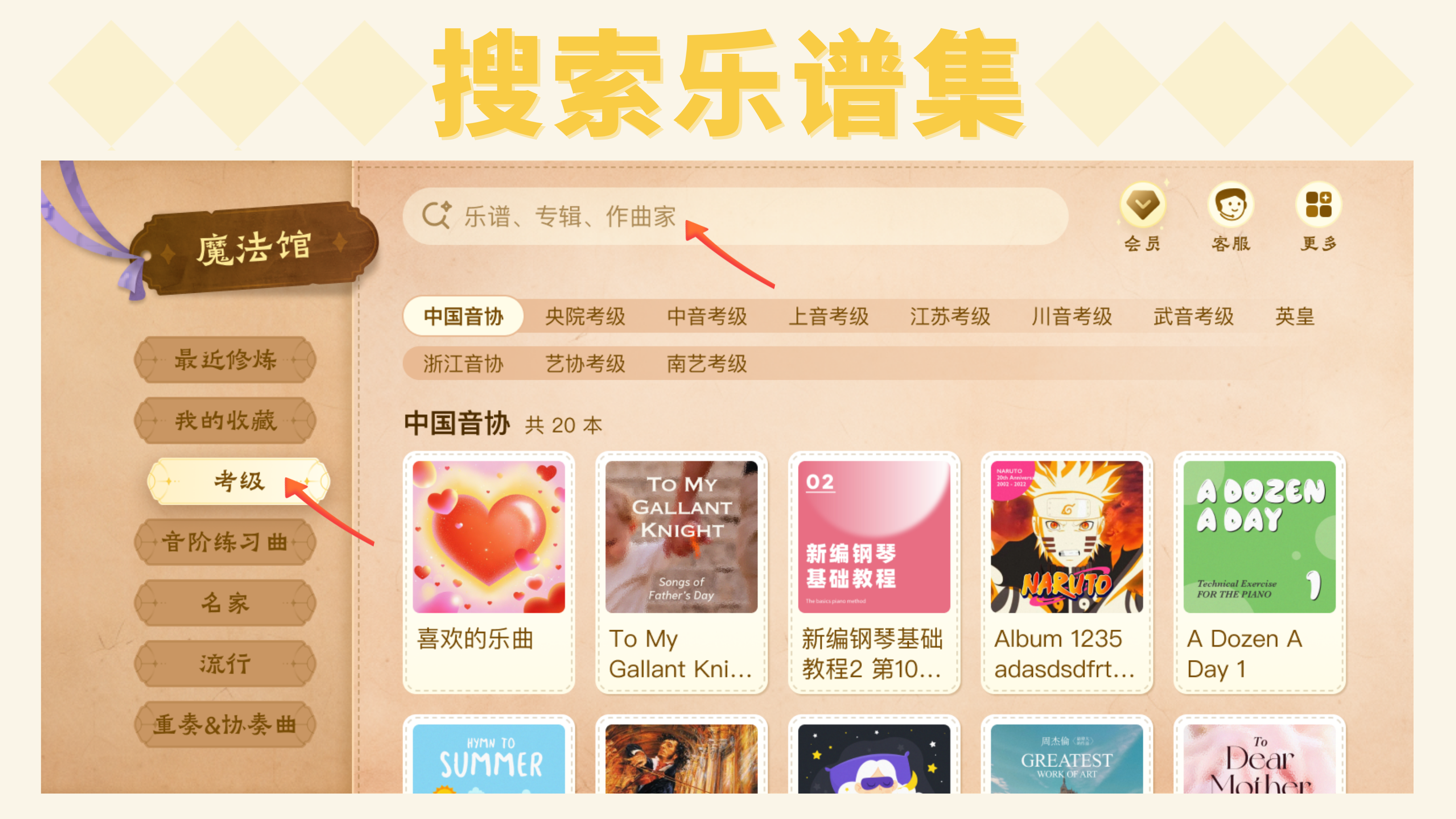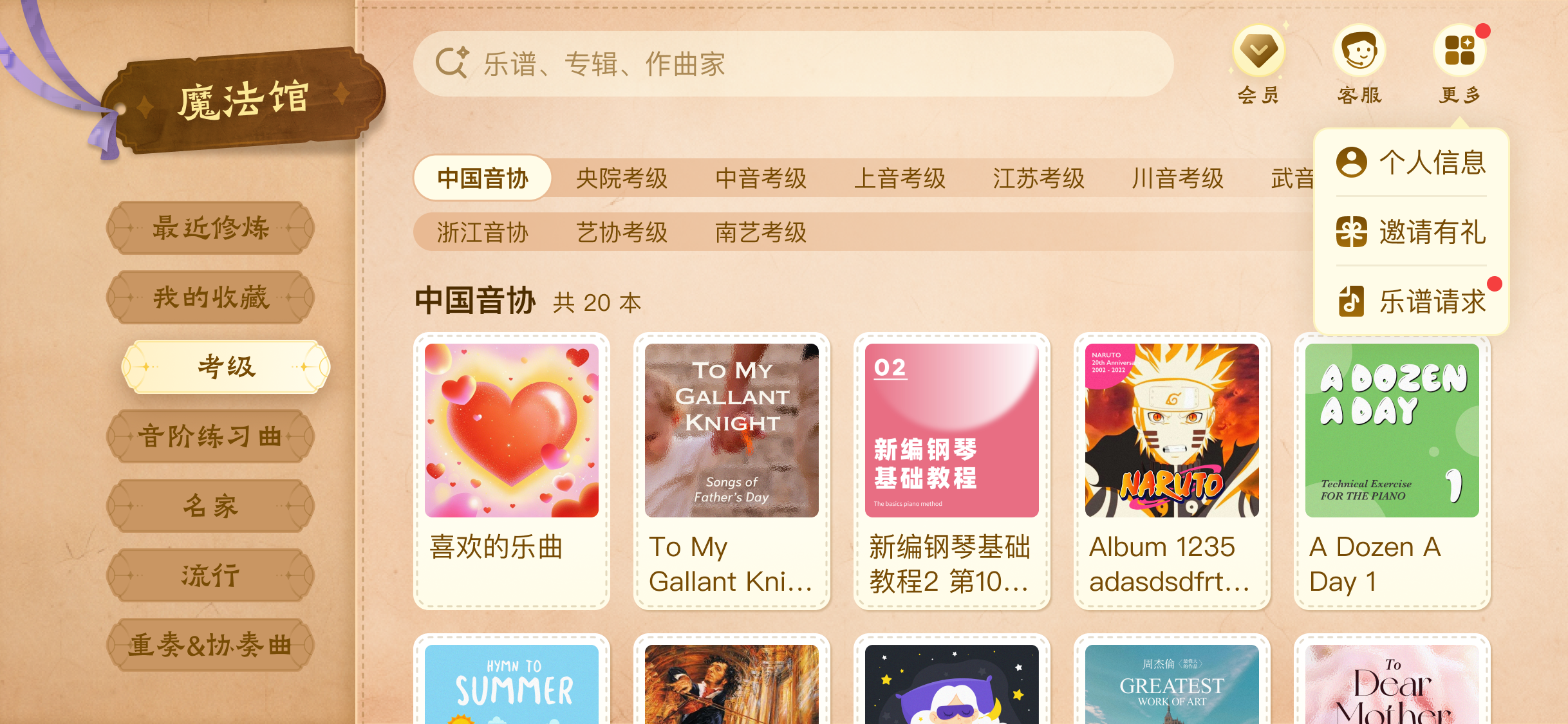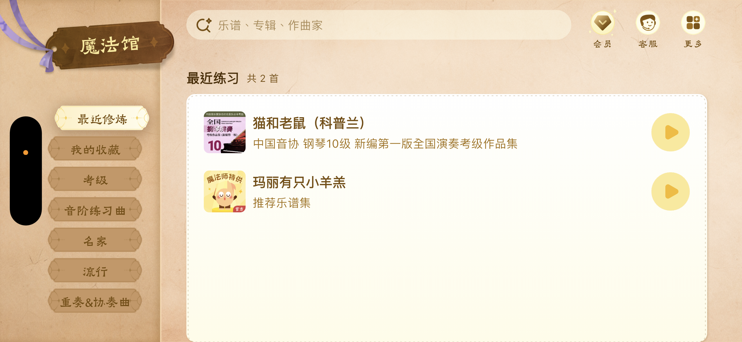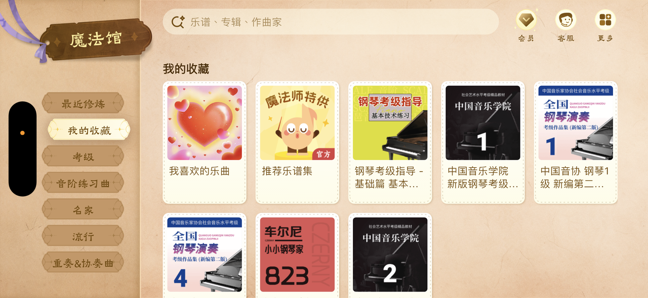 除了丰富的乐谱资源供你选择,魔法馆中还会收录「最近修炼」和「我的收藏」!