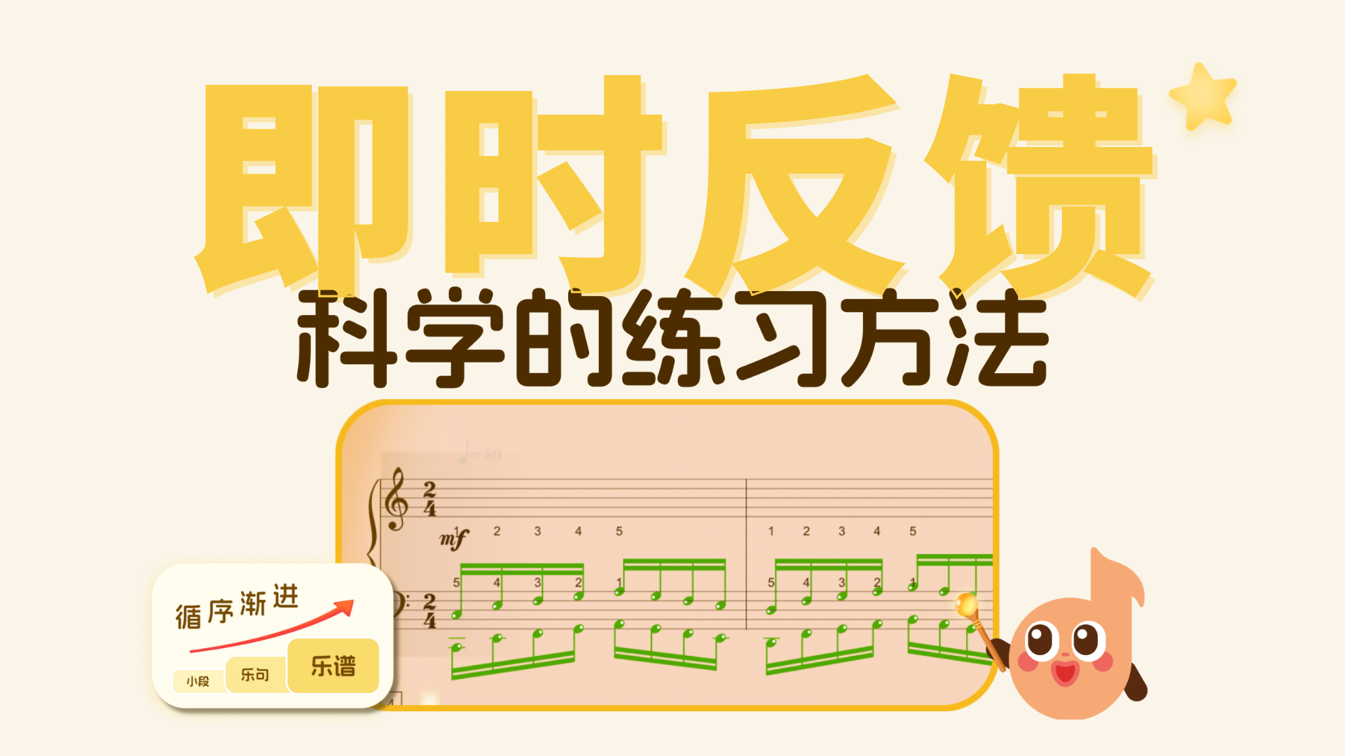 使用「自动跟随不中断」技术,即使演奏出错,也不会被卡住,能继续完成整首乐曲;着重训练节奏感和流畅度。