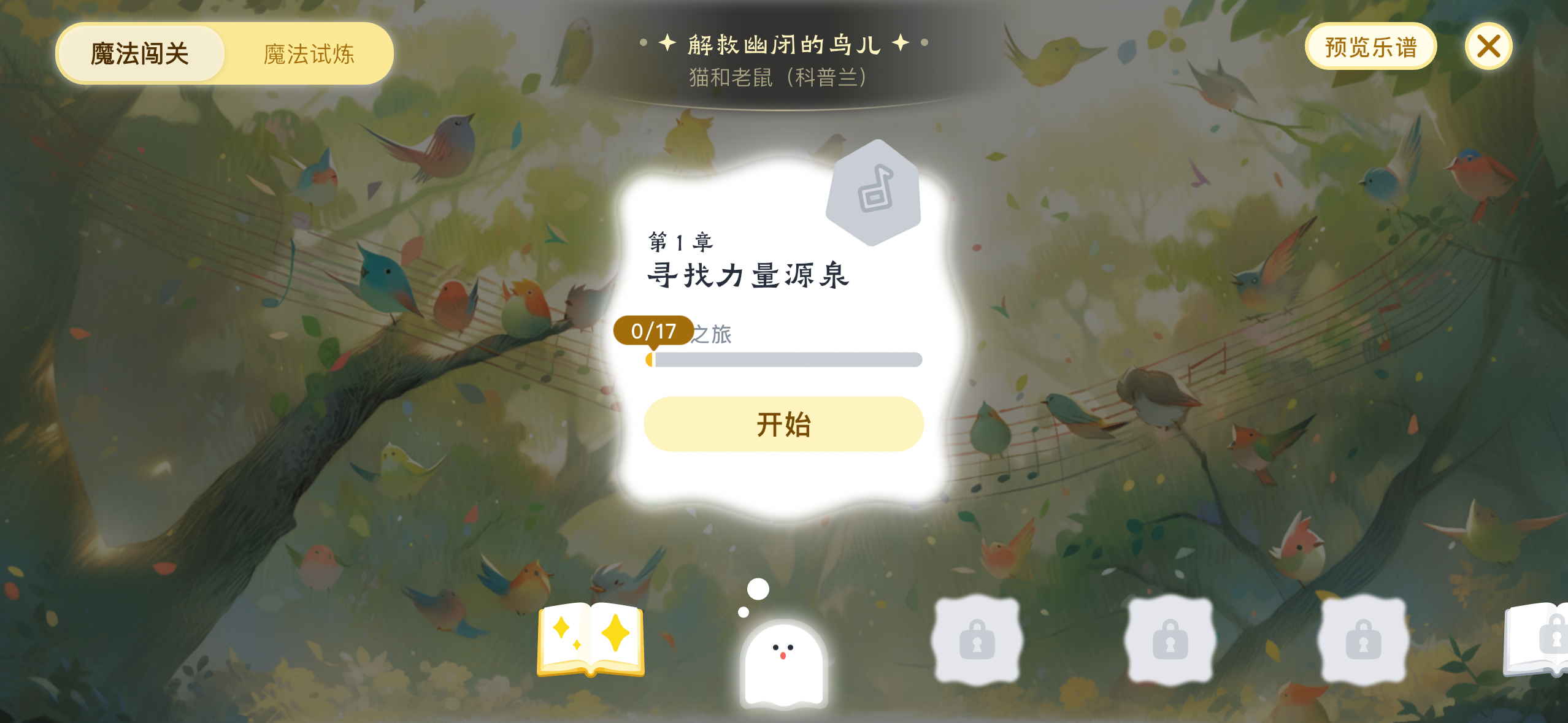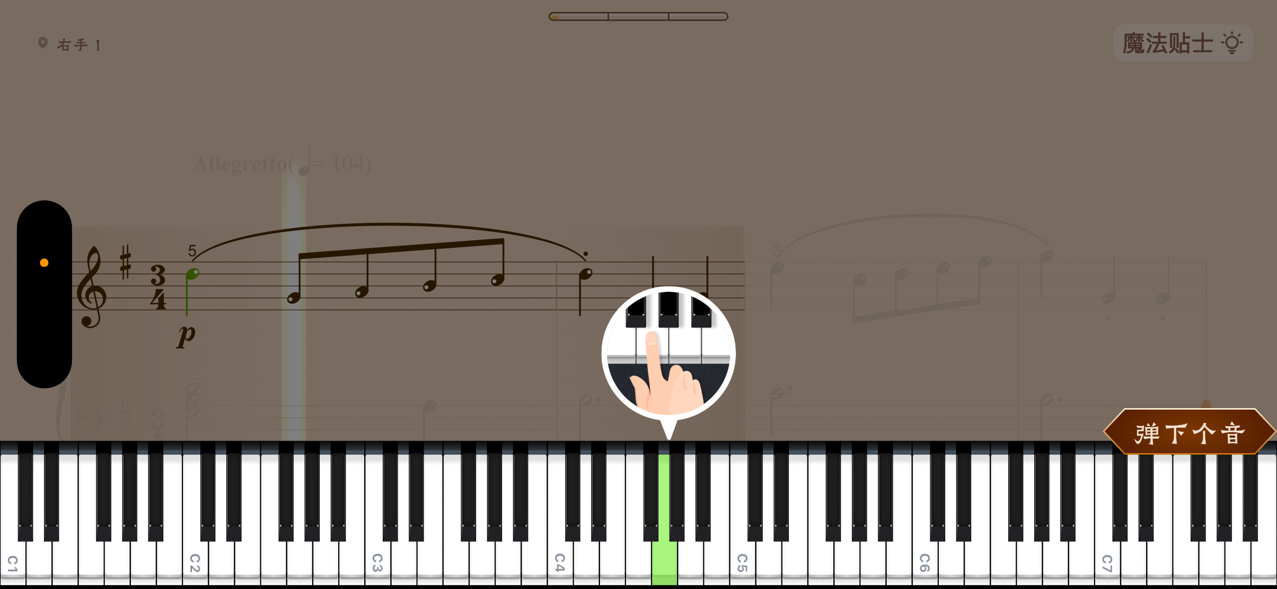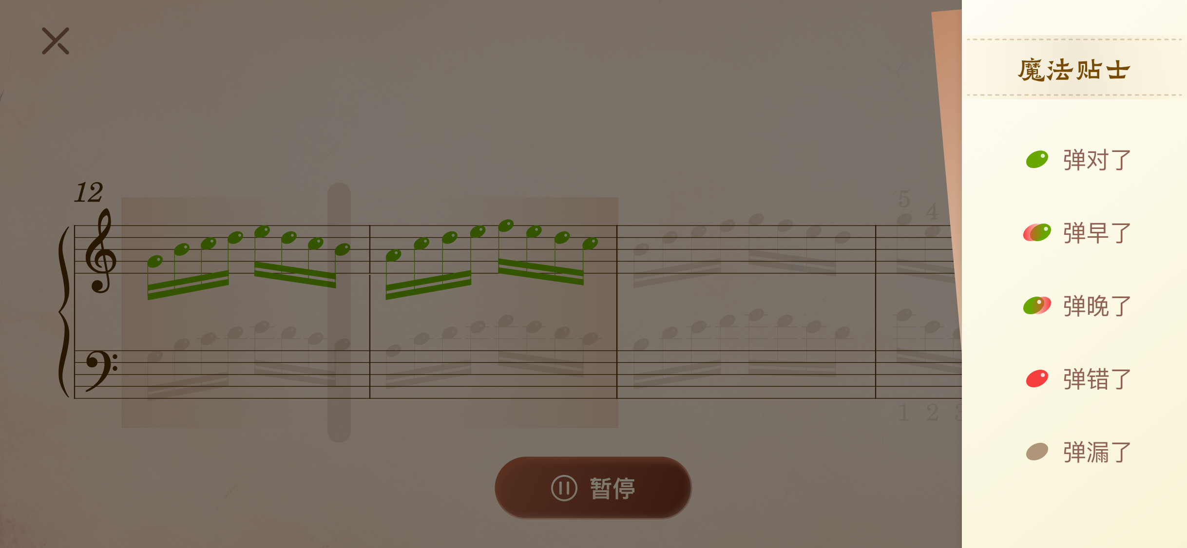 「魔法闯关」,专注逐音攻破新乐谱,每个音符都有实时反馈,需要一个一个音都弹对才能往下弹,适合初学者夯实基础。